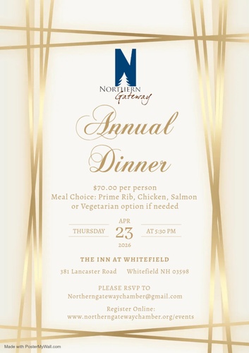 Event Description:Join the Northern Gateway Regional Chamber of Commerce for our Annual Meeting & Dinner on Thursday, April 23, 2026 at the Inn at Whitefield.