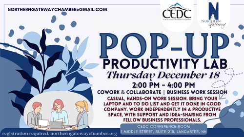 Location:CEDC Conference Room: 1 Middle Street, Suite 218, Lancaster, NHDate/Time Information:December 182-4PMContact Information:Fees/Admission:FreeSet a Reminder: